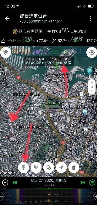 2、红点是选择好的机位,左下角的相机图标就是“选择拍摄点”。中间选择你的镜头焦距,我当时手里只有一只200mm。