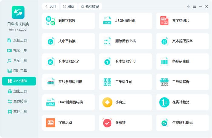 提供了一些常用的小工具,可以有效的提升办公效率,包括:简体繁体字转换、大小写转换、二维码生成、二维码解析、条形码生成、json编辑器;