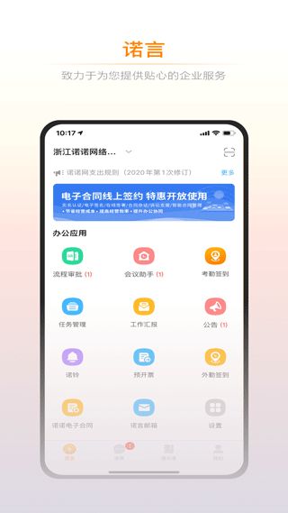 通过诺言企业通讯录可快速查找公司部门同事,发起在线沟通,工作交流无障碍。防伪税控用户可通过诺言客服模块直达所属航天信息服务单位,进入在线服务通道,远程解决防伪税控问题。