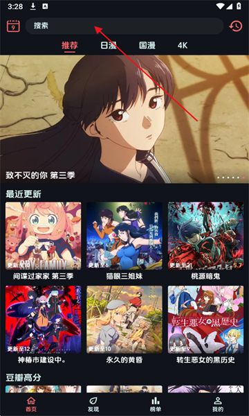 1、下载并进入软件,在软件首页会推荐最近热门的动漫作品,可以直接点击开始收看,或者点击上方搜索