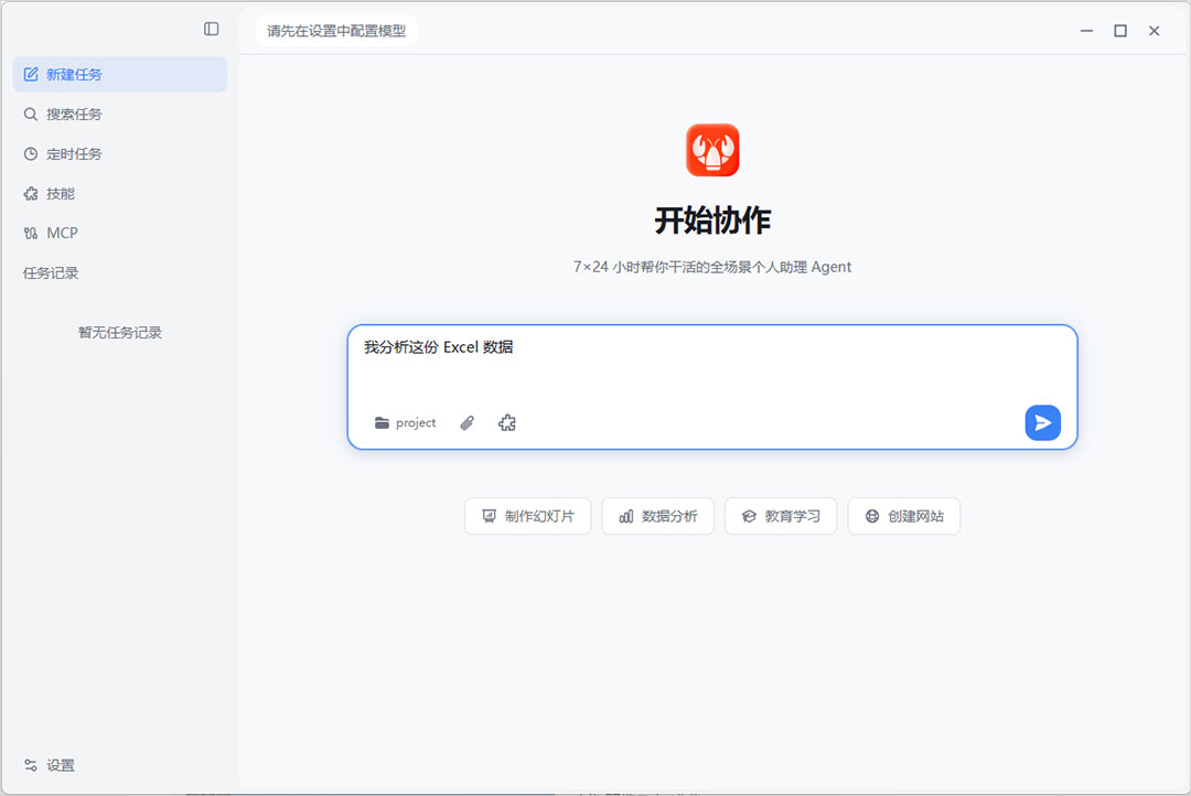 在输入框中描述你的任务,比如「帮我分析这份 Excel 数据」