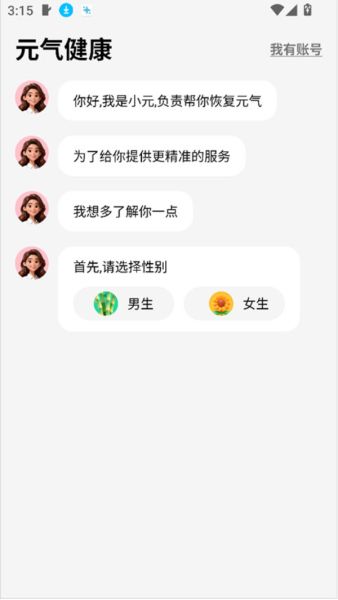 1、打开登录元气健康app后首先它会收集你一些基本信息,如性别、年龄、身高体重等