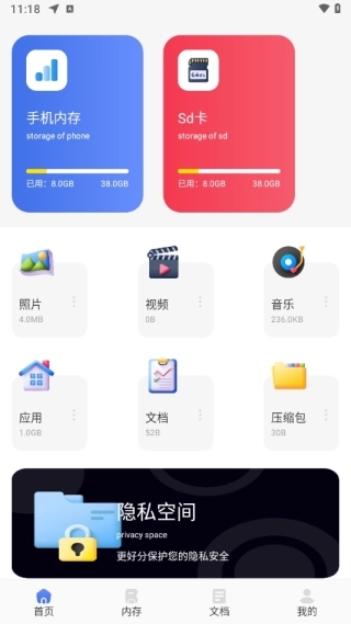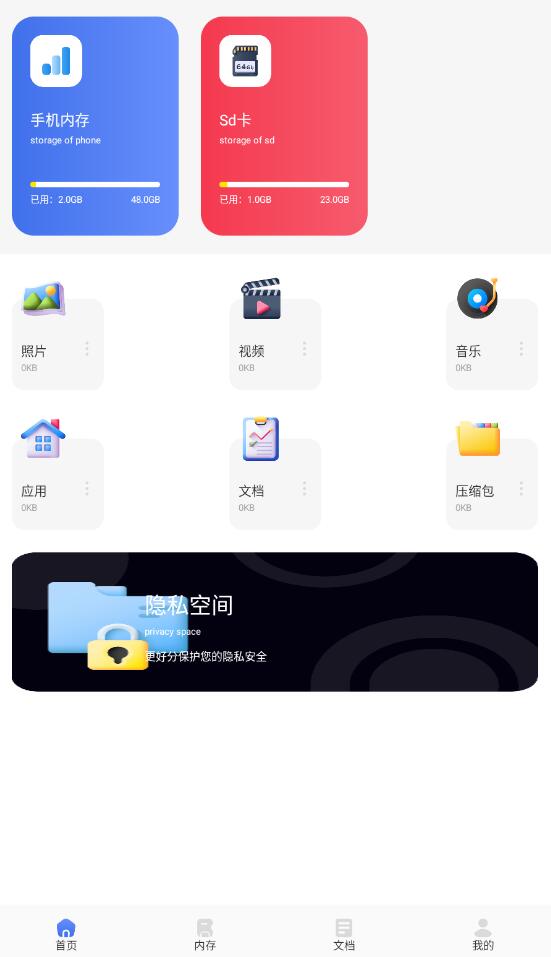 1、在首页,你能一览所有功能,照片、视频、音乐以及应用等资源都在此汇聚,所有资源一目了然。不仅如此,还有一个隐私空间,可供存放私人隐私资源。