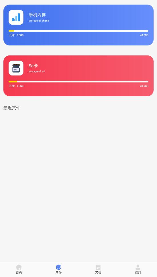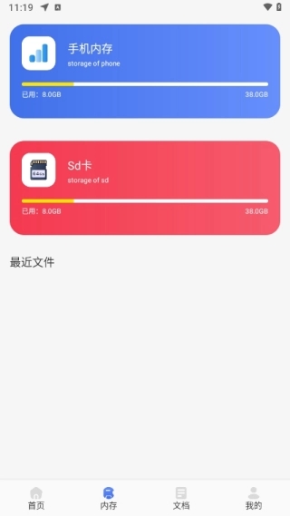 3、通过内存这里可以快速查看自己手机储存装备,以及最近打开过哪些文件等等!