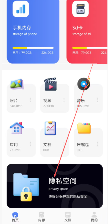 1.用户进入软件之后可以直接在首页中点击隐私空间即可设置密码。