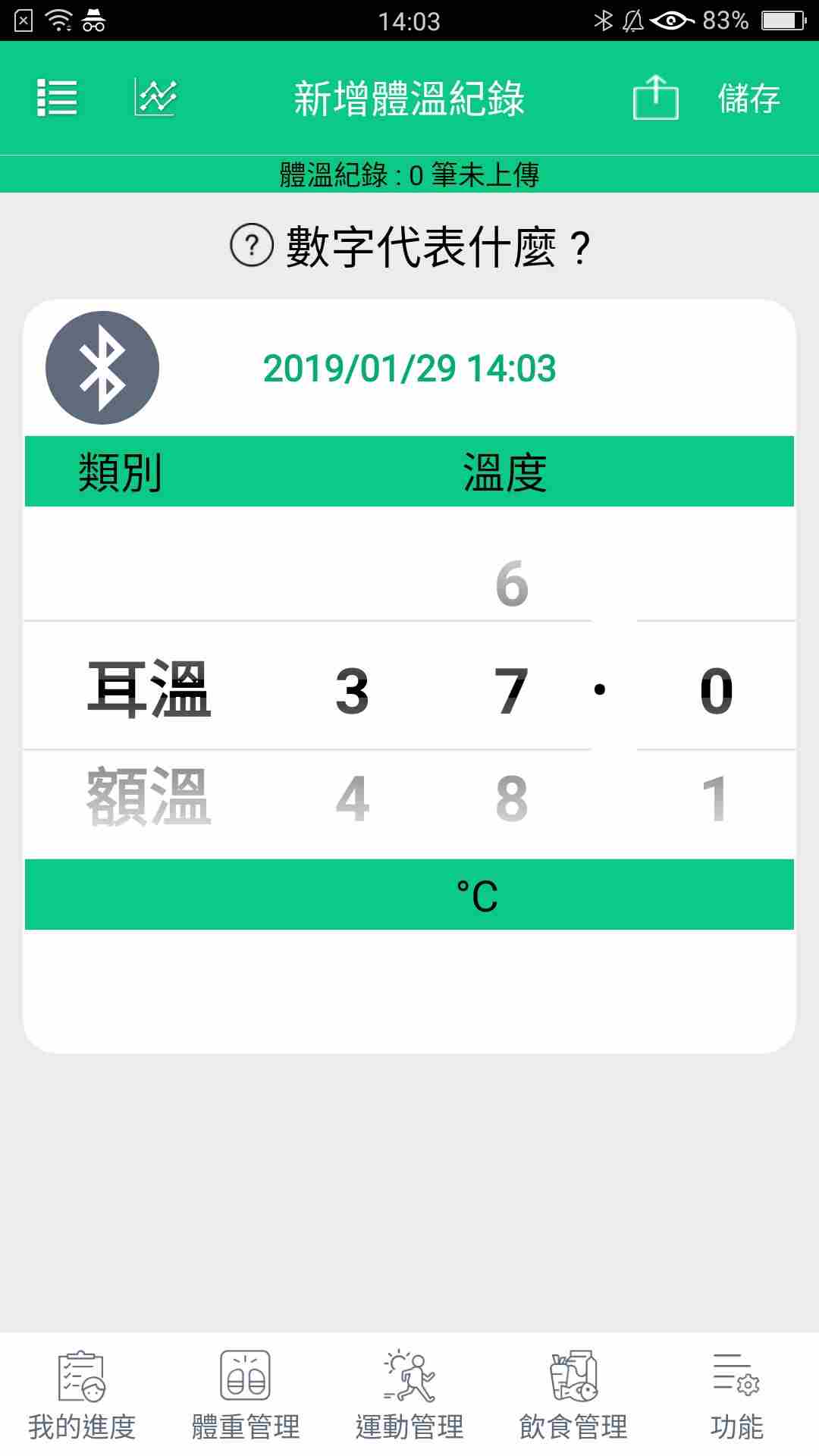 2、进入 “新增体温记录” 页面,输入耳温、额温等体温数据,点击储存。