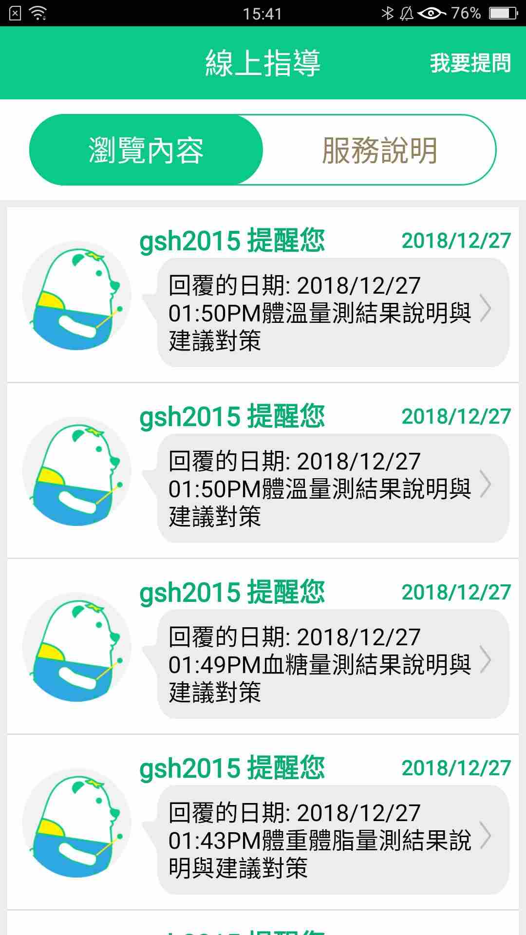 3、在 “线上指导” 页面,浏览体温、血糖等测量结果说明与建议对策。