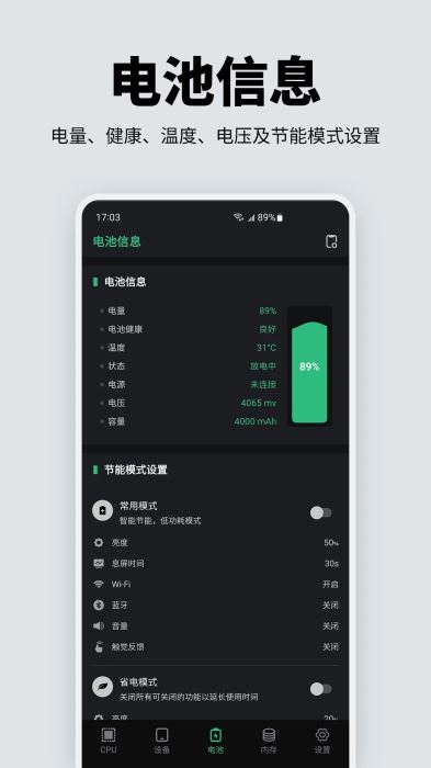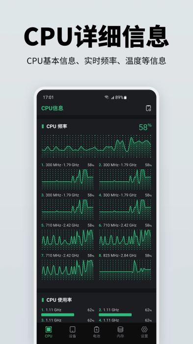 实时监测CPU的温度和频率,分析 CPU 温度和频率的历史使用数据,并且支持多核 CPU 频率的同时监测,CPU或电池过热报警