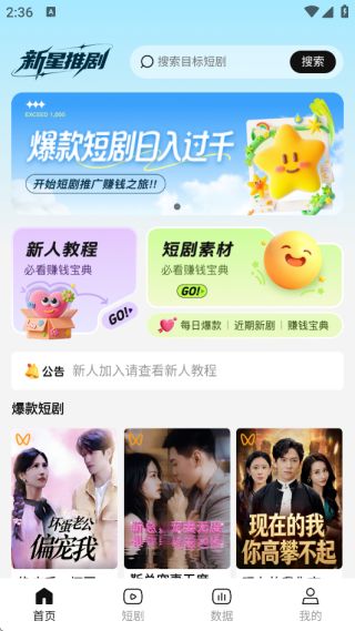 新星推剧app围绕“短剧推广 + 内容变现”打造完整平台体系,资源更新及时,功能实用,操作流程清晰。通过二次创作与推广分成机制,为内容创作者提供了更多变现可能,适合希望参与短剧推广、拓展内容收益渠道的用户。