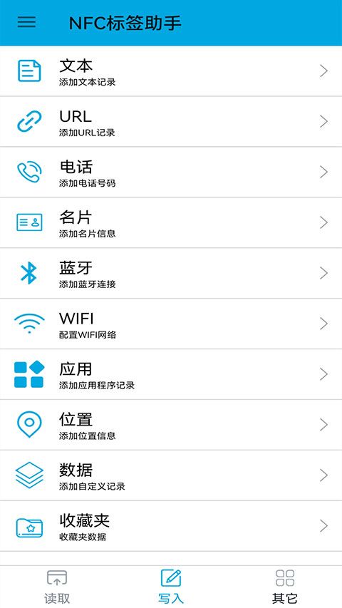 支持文本、URL、电话号码、名片信息、蓝牙速接、Wi-Fi 配置、应用程序记录等多种数据类型写入 NFC 标签,满足用户在不同场景下的多样化需求。