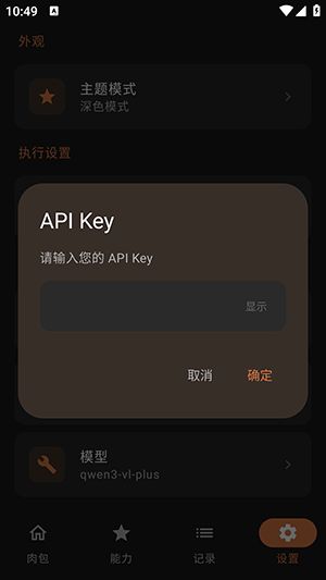 重要:进入肉包app设置页面,配置你的API Key