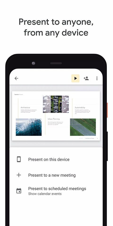 谷歌幻灯片app是一款由谷歌公司开发的在线演示文稿应用程序,可通过网页或移动设备访问和使用,它提供了一个简单的界面和易于使用的工具,使用户可以轻松地创建漂亮、专业的演示文稿,用户可以从各种模板中选择,并自定义字体、颜色、布局等元素,并且在这里所有的演示文稿都保存在云端,用户可以从任何设备随时访问和编辑它们,这也意味着多个用户可以同时协作编辑同一份文稿,并即时看到其他用户的更改。