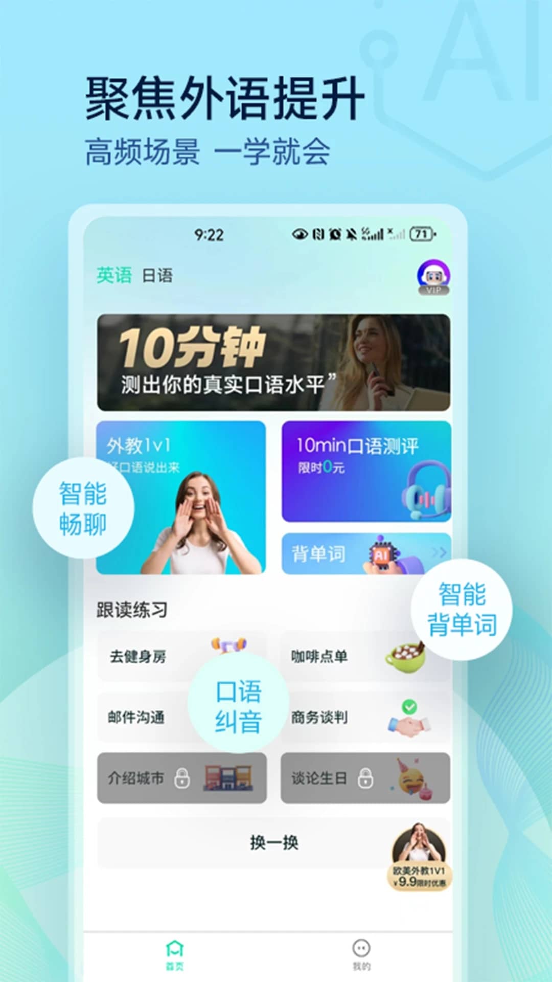 提供跟读练习功能来跟着高频场景中的外教课堂练习英语口语。