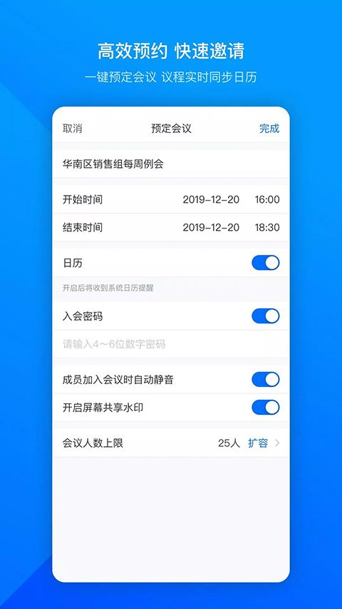 1、界面清爽简洁,一键预约、发起、加入会议;