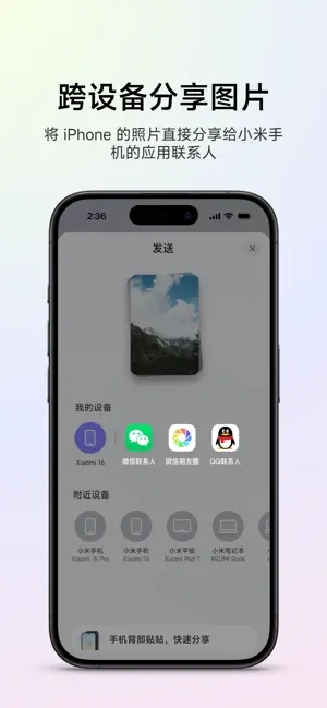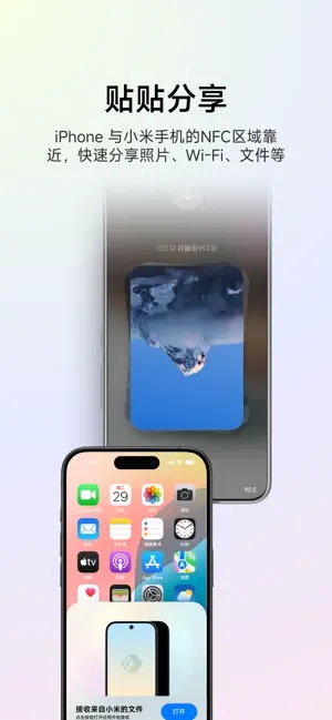 与另一个小米手机或 iPhone 的 NFC 区域靠近,即可快速分享。