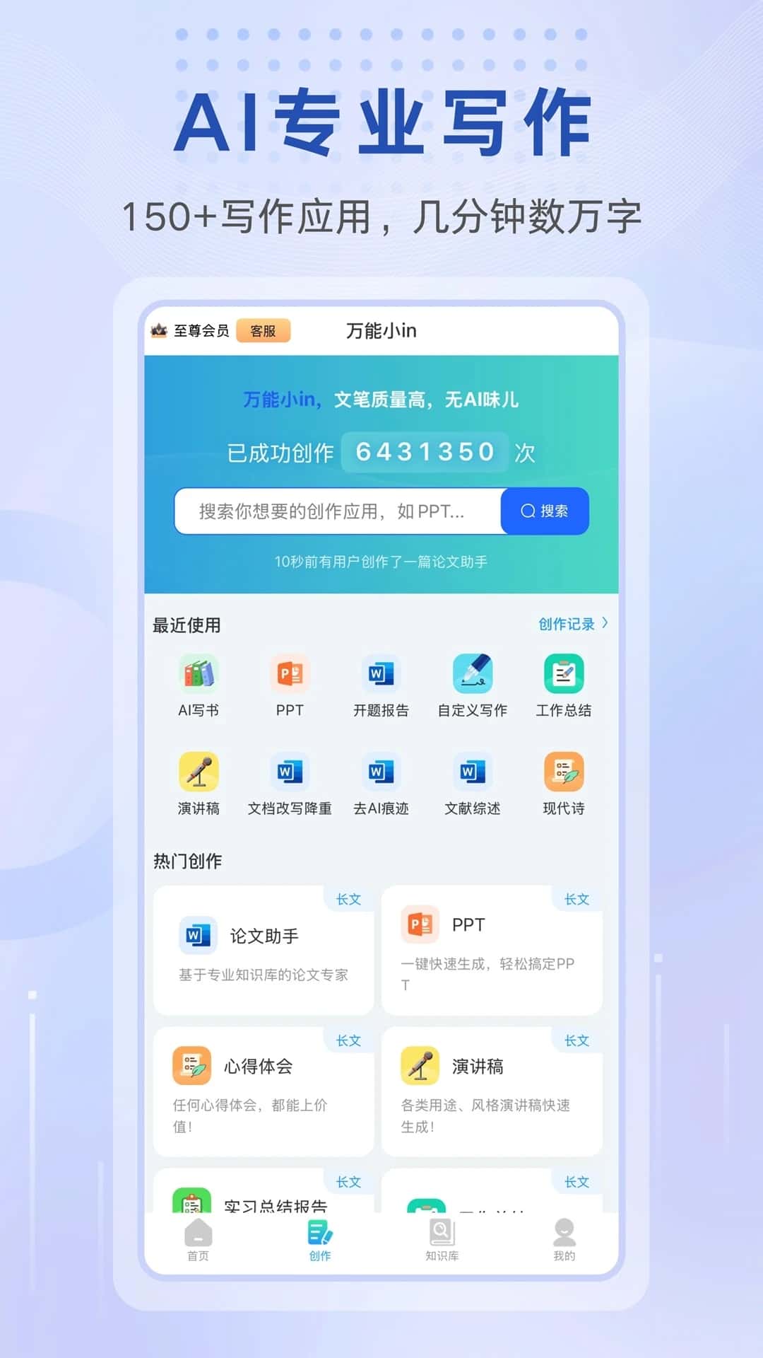 1、AI创作:超长上下文滚动处理技术,支持百万字级书稿创作;150+写作应用模板,几分钟数万字,格式规范、内容专业,支持基于个人知识库的个性化写作,AI长文写作的开创者。