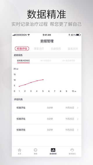 4、支持进行数据管理,包括标准评估、康复治疗等数据,可以查看展示的趋势报告。