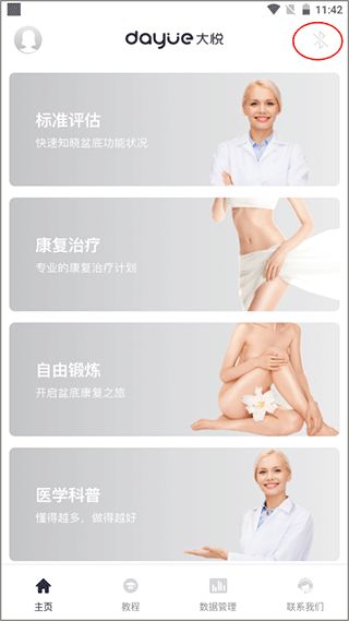 2、打开“大悦盆底”主界面,点击右上角的蓝牙图标,确保手机蓝牙及定位已经打开。