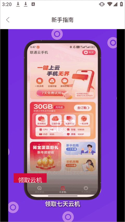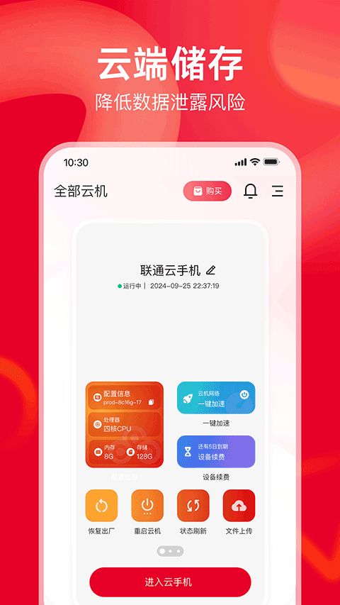 联通云手机提供30GB定向流量,云机下载视频速度快,且视频云端储存不占真机内存。