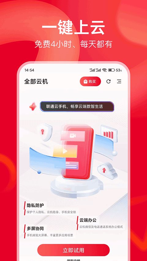 联通云手机支持iOS用户使用安卓云机,实现跨系统竞技。同时,云手机独立于本地手机,满足空间、通讯、应用、消息私密安全保障,公私分离,支持绑定工作号,保护主号隐私。