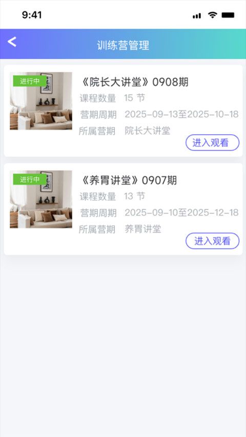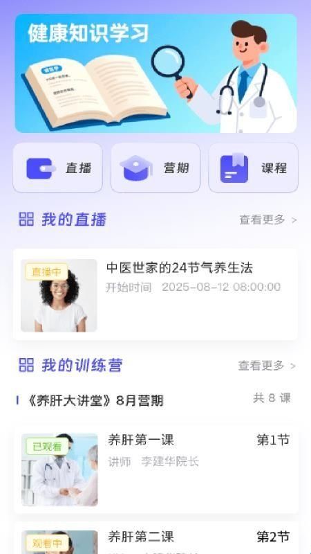 用户可加入训练营,实时观看课程,获取养生方法,提升健康管理能力。