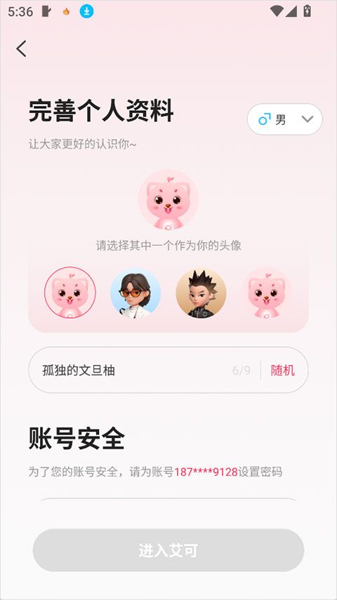 1、打开登录艾可直播app后完善一些基本资料,设置下账号密码