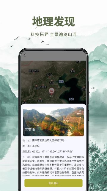 3、定位至目标地点如武夷山,查看其地理位置、经纬度及生态介绍,了解区域自然与人文信息。