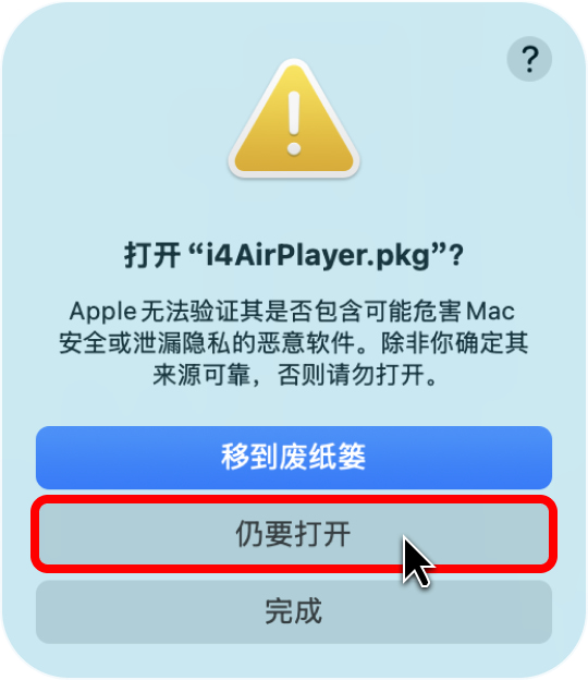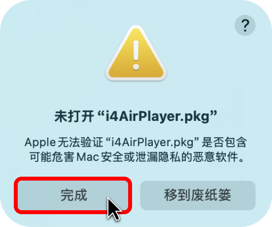 第一步:安装出现未打开“i4AirPlayer.pkg”时,点击“完成”,如下图: