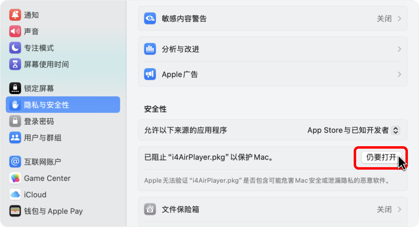 第二步:打开“系统设置>隐私与安全性>安全性”,点击“仍要打开”,如下图: