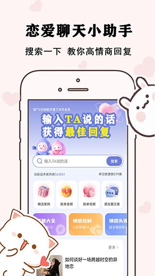 草莓恋爱app是一款非常专业的恋爱话术学习软件,轻松帮你解决不会聊天、搭讪、恋爱等难题,秒变情圣。软件中为用户们提供了开场白、初始聊天、安全感、走心聊天、建立情感信任、约会、表白等七大模板,用户可根据自己的相处状态来选择相相对应的恋爱话术,这样也就可以轻松的与自己心仪对象进行交流,更好的让对方了解你加脱单的机会。另外恋爱方程式还提供了多种不同的场景对话学习,致力帮助用户告别不会聊天的问题,轻轻松松秒变高情商,快速脱单。