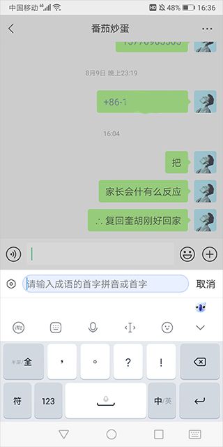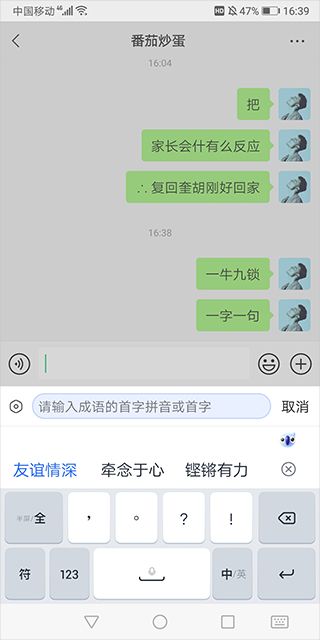 3、例如输入“一”,就会发送出以一打头的成语