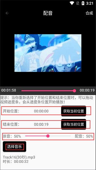 4、根据自己的需求更改【开始位置】及【结束位置】的时间点、原音与配音的声音大小分配、选择音乐做背景;