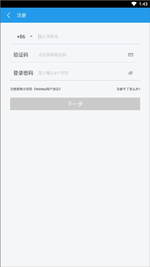 3、输入手机号、密码后,获取验证码并填写,点击下一步即可完成注册;