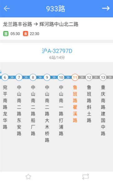 5、点击鲁班路瞿溪路,我们就可以看到我们需要等待13分钟左右,还有6站到达,并且还有详细的车牌号,非常方便;