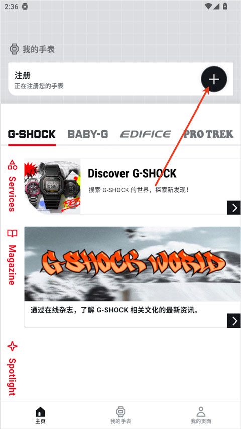 1、打开手机APP:CASIOWATCHES,点击 “我的手表”再点击 “+”号