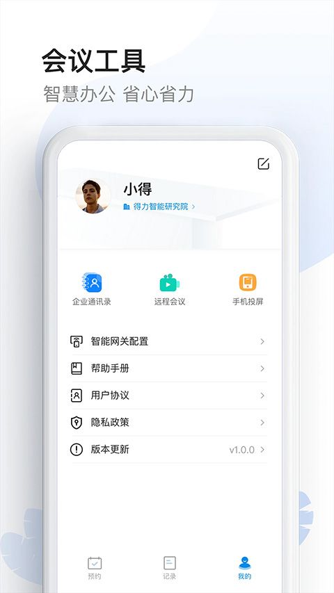 智能会议桌app是由得力集团旗下得力普乐士品牌智能会议桌设备推出的一款手机客户端应用,软件结合企业会议场景,提供会议记录、会议预约、实时翻译、设备控制等功能,为商务接待、会议洽谈提供完备的智能会议解决方案。软件功能多,辅助强大,用户使用方便;通过软件可以管理旗下智能会议桌设备,支持会议记录、一键预约会议、扫码直连开会等,大大提高了开会效率,带来更优质的会议服务,有需要朋友快来下载吧!