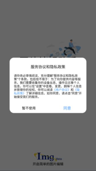 2、进入后阅读并同意imgmeta图片编辑助手的用户协议