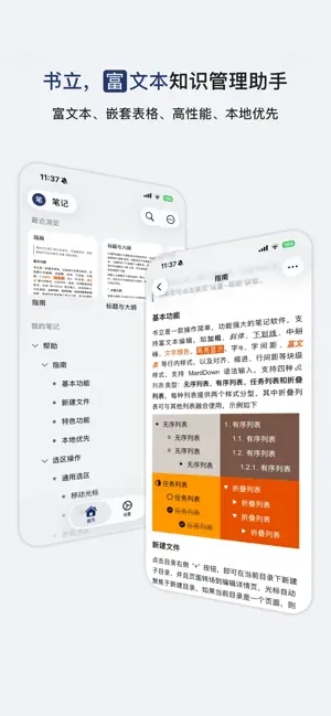 书立是一款操作简单,功能强大的笔记软件,支持富文本编辑,如加粗、斜体、下划线、中划线、文字颜色、高亮显示、字体、字号、字间距、富文本等行内样式,以及对齐、缩进、行间距等块级样式,支持四种列表类型:无序列表、有序列表、任务列表和折叠列表,每种列表提供两个样式分型,其中折叠列表可与其他列表融合使用。