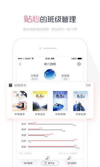 【班级】老师一键留作业,只需添加图书练习,还可以扫一扫;清晰的学生作业提交情况,考试成绩走势,让老师辅导学生更精准;