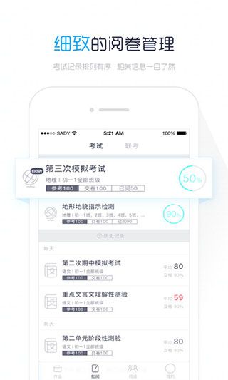 阅卷易app是支持多平台同步使用的一款智能阅卷判卷神器,该软件针对全国百万教师日常阅卷判卷所需,结合时下常用智能硬件设备使用习惯,提供成绩自动同步、数据报告导出、考试云端阅卷、组卷及留作业等一系列实用功能服务。可全面助力老师快速高效的进行阅卷判卷,精确统计作业,生成学生的实际学习报告,减轻繁重的阅卷判卷负担,同时还能通过各项数据报告,了解学生水平,让教学效果事半功倍,欢迎下载使用~
