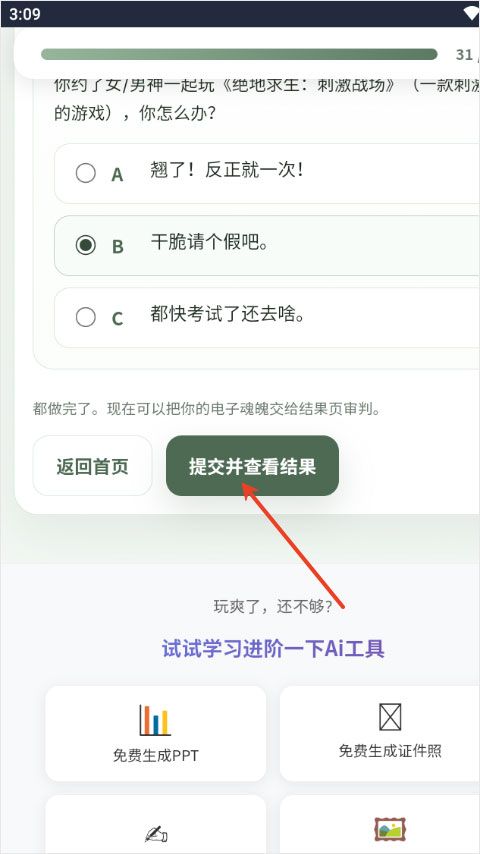 3、答完题目后就可提交并查看结果;