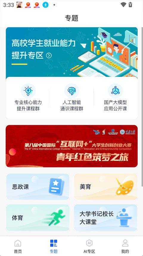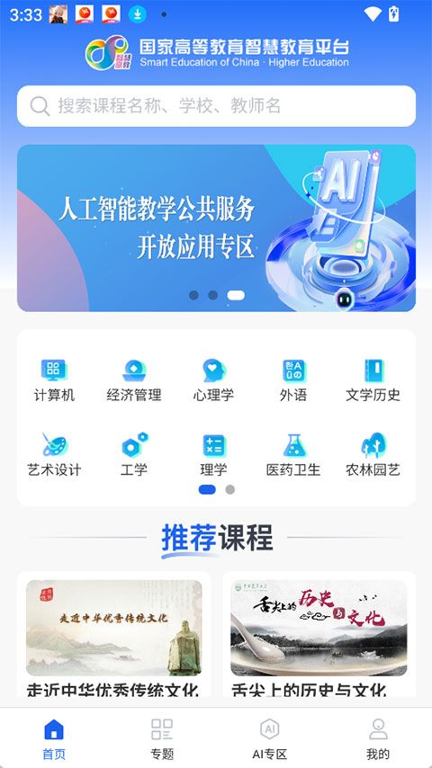 将不同专业的课程资源进行精细化分类,在AI专区也支持按学科、课程类型(如通识课、特色交叉课)等快速定位相关人工智能课程,方便用户查找所需学习内容。