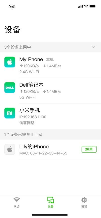 4、管理已连接设备,支持一键禁用、限制上网带宽;