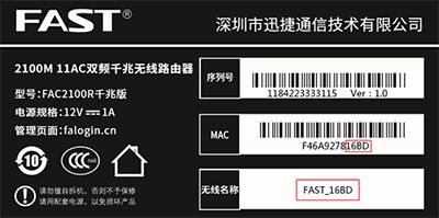 路由器默认的无线信号名称,可以在路由器底部标贴上查看:FAST _XXXX(XXXX为路由器底部标贴MAC地址后四位),如下图: