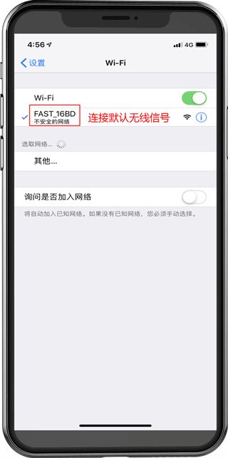 打开手机的无线设置,连接路由器默认的无线信号,如下图: