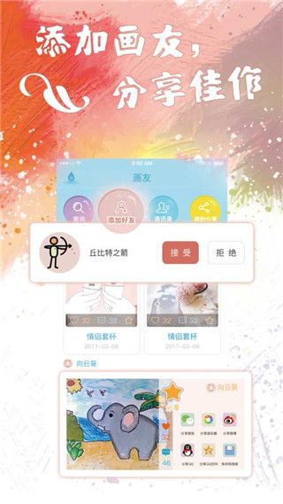 3、以画会友:轻松转发第三方社交平台,自由创建专属的“画友圈”,独立的画作分享平台,让小伙伴们都来围观吧!