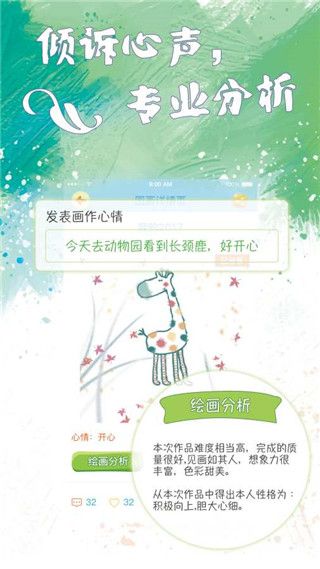 2、心灵导师:深度专业解析画作的心理表征及画者潜质。协助了解画作的心理意义,洞悉画者个性特质及情绪障碍,给予引导和针对性沟通建议。