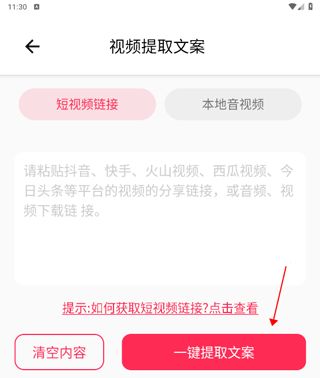 2、选择短视频或本地视频,然后将你要提取的文案的视频链接粘贴在下方,再点击“一键提取文案”即可。