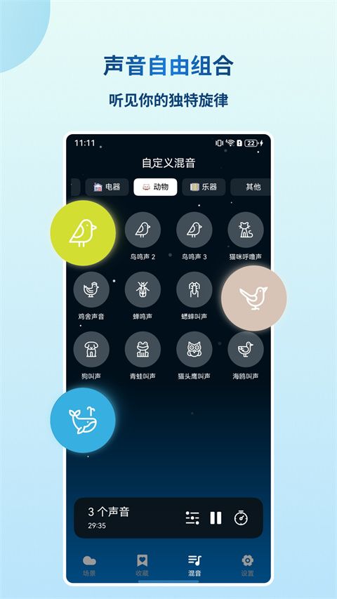 声音混合:可以自由组合不同声音,打造专属于自己的“助眠背景”。