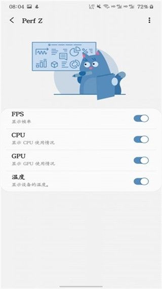 4、首先,第1个Perf Z,功能是自定义显示帧率,以及可以实时监测CPU/GPU的使用情况,还可以监测设备的温度并显示,让我们时时刻刻了解手机,在运行游戏过程中的一些状况。